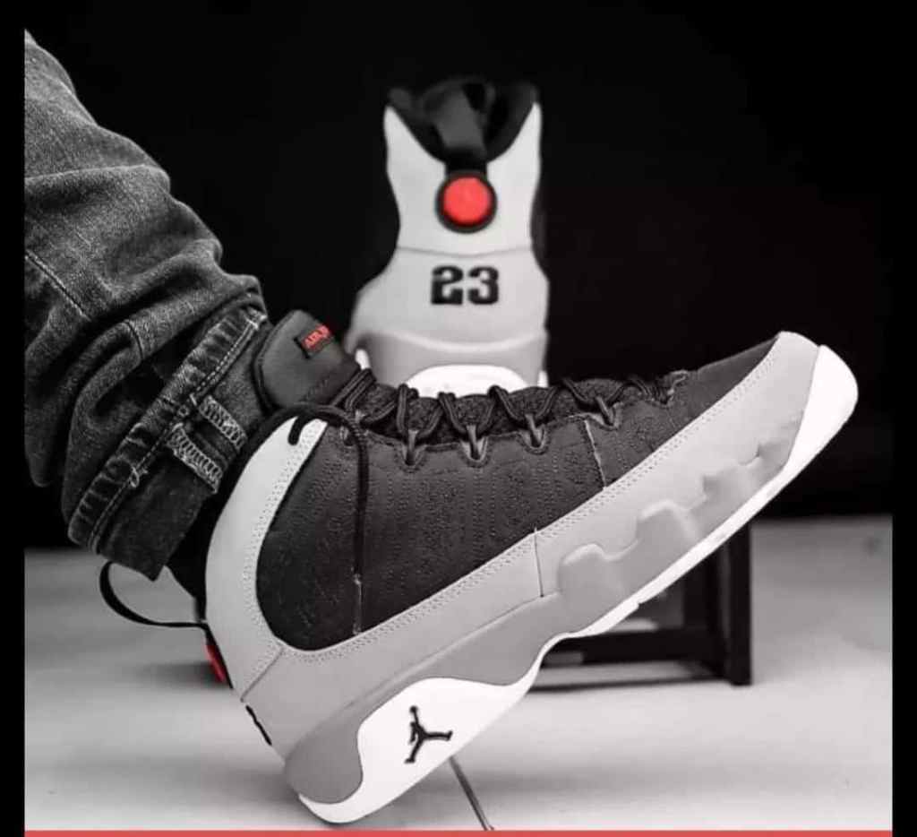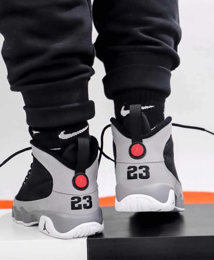 Nike Air Jordan 9 Particle Grey gives monochromatic colourways a good name. Deep black sets the stage as it dresses up the breathable mesh upper and padded tongue, while grey leather reinforcements in the toe, mudguard, heel and ankle areas seamlessly complement the inky base. Hits of bright berry red in this Air Jordan 9’s tongue label and pull tab add a vibrant touch to an overall simple palette. Underfoot, the grey midsole packs Air-Sole units under the heel and ball for comfortable lightweight cushioning that allows for a wide range of quick movements.