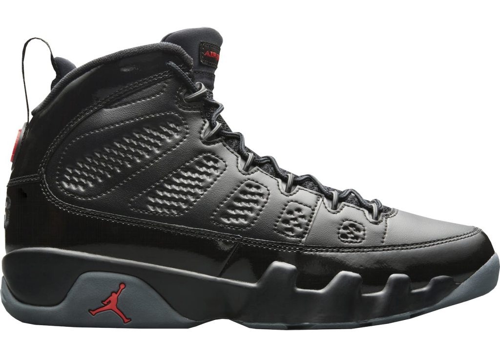 Nike Air Jordan 9 Particle Grey gives monochromatic colourways a good name. Deep black sets the stage as it dresses up the breathable mesh upper and padded tongue, while grey leather reinforcements in the toe, mudguard, heel and ankle areas seamlessly complement the inky base. Hits of bright berry red in this Air Jordan 9’s tongue label and pull tab add a vibrant touch to an overall simple palette. Underfoot, the grey midsole packs Air-Sole units under the heel and ball for comfortable lightweight cushioning that allows for a wide range of quick movements.